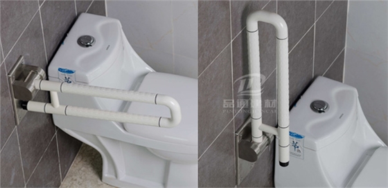 圖1:PT-WY-01款坐便器扶手,如廁時(shí)蹲下或起身能減輕腿部和腰部的壓力。亦可上翻靠墻面,節(jié)省空間。