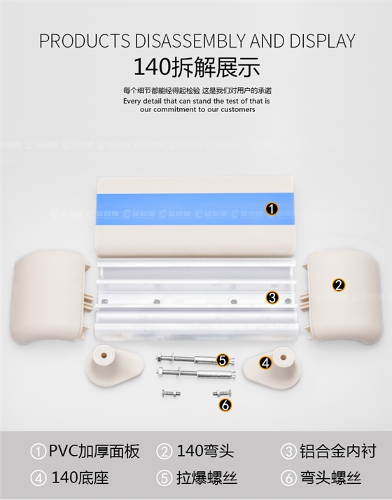 (老人院扶手,抗菌防滑扶手,酒店通道扶手)由四個部分組成,其中面板采用 PVC(聚氯乙烯材)料生成,材料長度5米,厚度2.0MM,可定制顏色。底座和封口采用ABS合成樹脂擠壓生成。扶手內(nèi)部采用鋁合金材料,鋁合金長度5米,有多種厚度可供選擇。